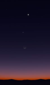سيلاحظ خلال بضعة ليالي قادمة أن الجانب الغير مضاء من سطح القمر مضيء بنور خافت عبارة عن ضوء الشمس المنعكس عن الأرض،ويوماً بعد يوم سيلاحظ أن هلال القمر تزداد اضاءته ويرتفع عالياً في السماء عند غروب الشمس ويبقى فترة أطول بعد بداية الليل وذلك لأن القمر يتحرك مبتعدا عن موقع غروب الشمس .